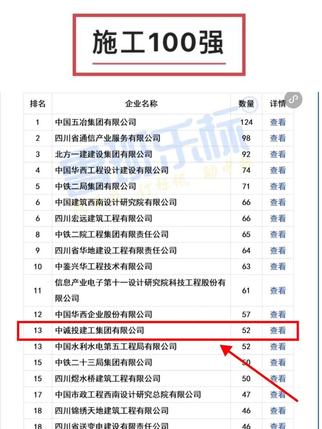 中誠(chéng)投建工集團(tuán)榮登2024年上半年四川省施工中標(biāo)100強(qiáng)榜單