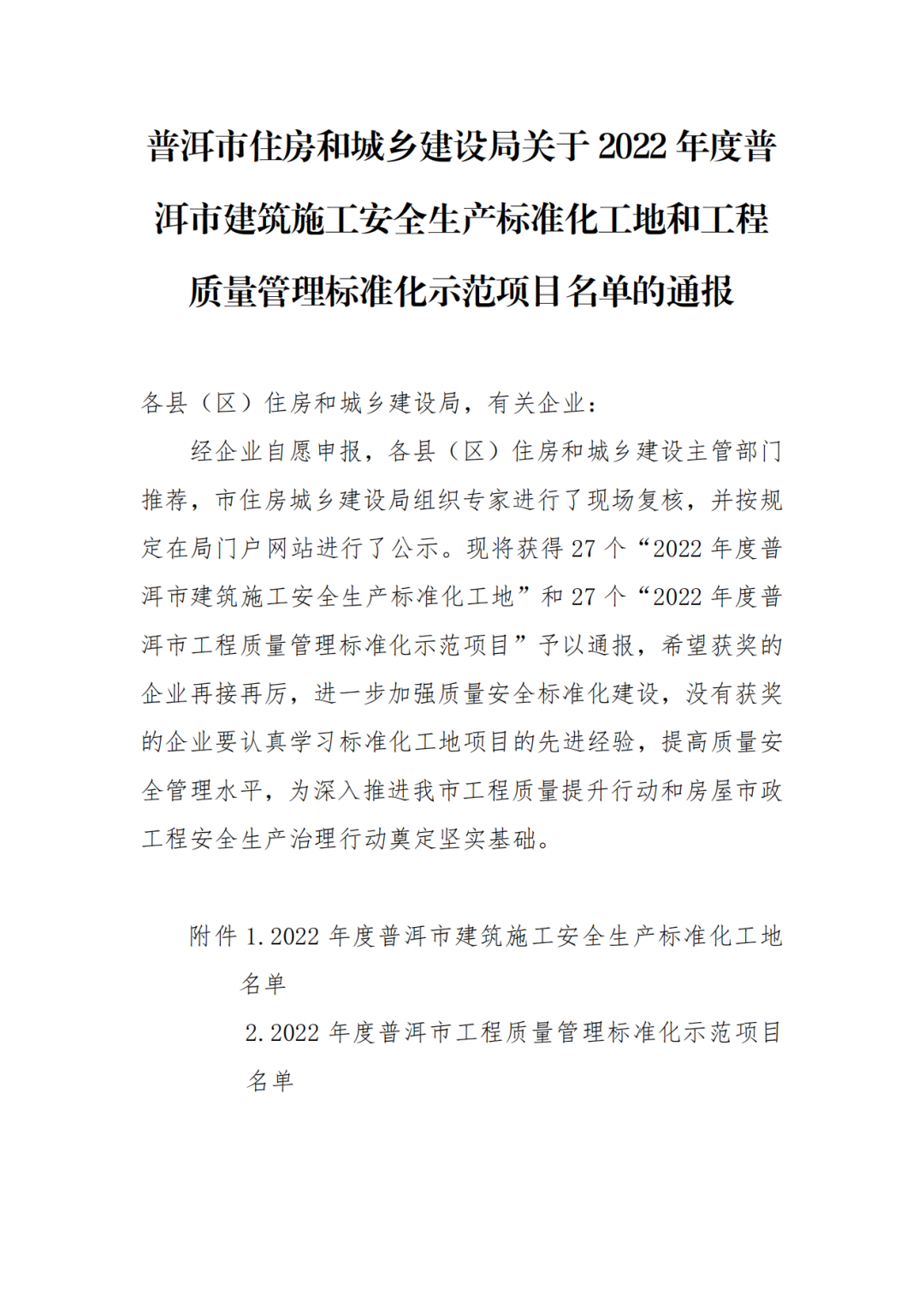 近期,云南省普洱市住房和城鄉建設局發布了《關于2022年度普洱市建筑施工安全生產標準化工地和工程質量管理標準化示范項目名單的通