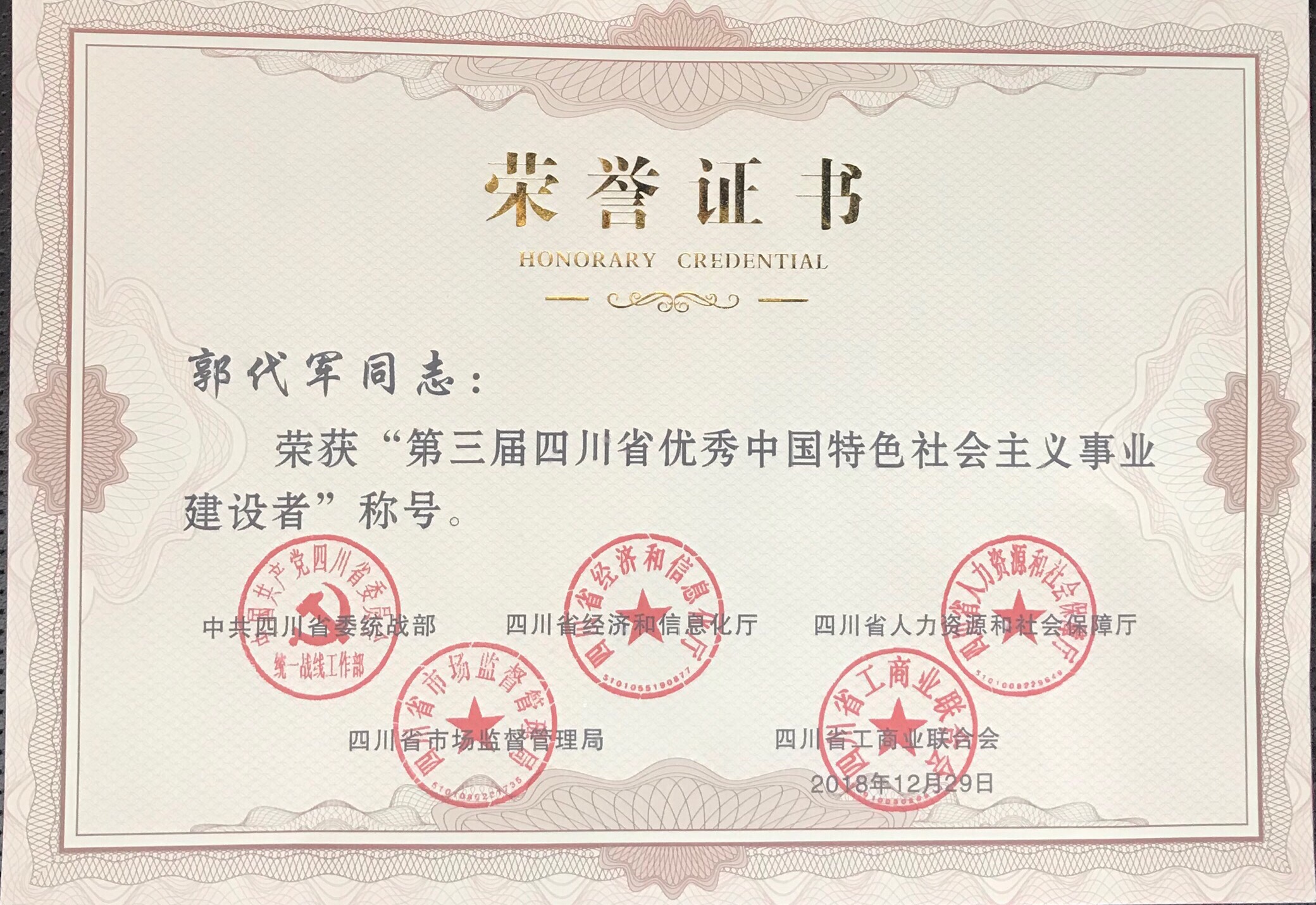 瑞雪兆豐年 歲末傳喜訊,2018年12月29日第三屆四川省優(yōu)秀中國特色社會(huì)主義事業(yè)建設(shè)者表彰大會(huì),暨省工商聯(lián)十一屆三次執(zhí)委會(huì)在成都隆重召開。會(huì)上發(fā)布了表彰決定,授予100名非公有制經(jīng)濟(jì)人士和新的社會(huì)階層人士“第三屆四川省優(yōu)秀中國特色社會(huì)主義事業(yè)建設(shè)者”稱號(hào),并頒發(fā)了獎(jiǎng)?wù)潞妥C書。