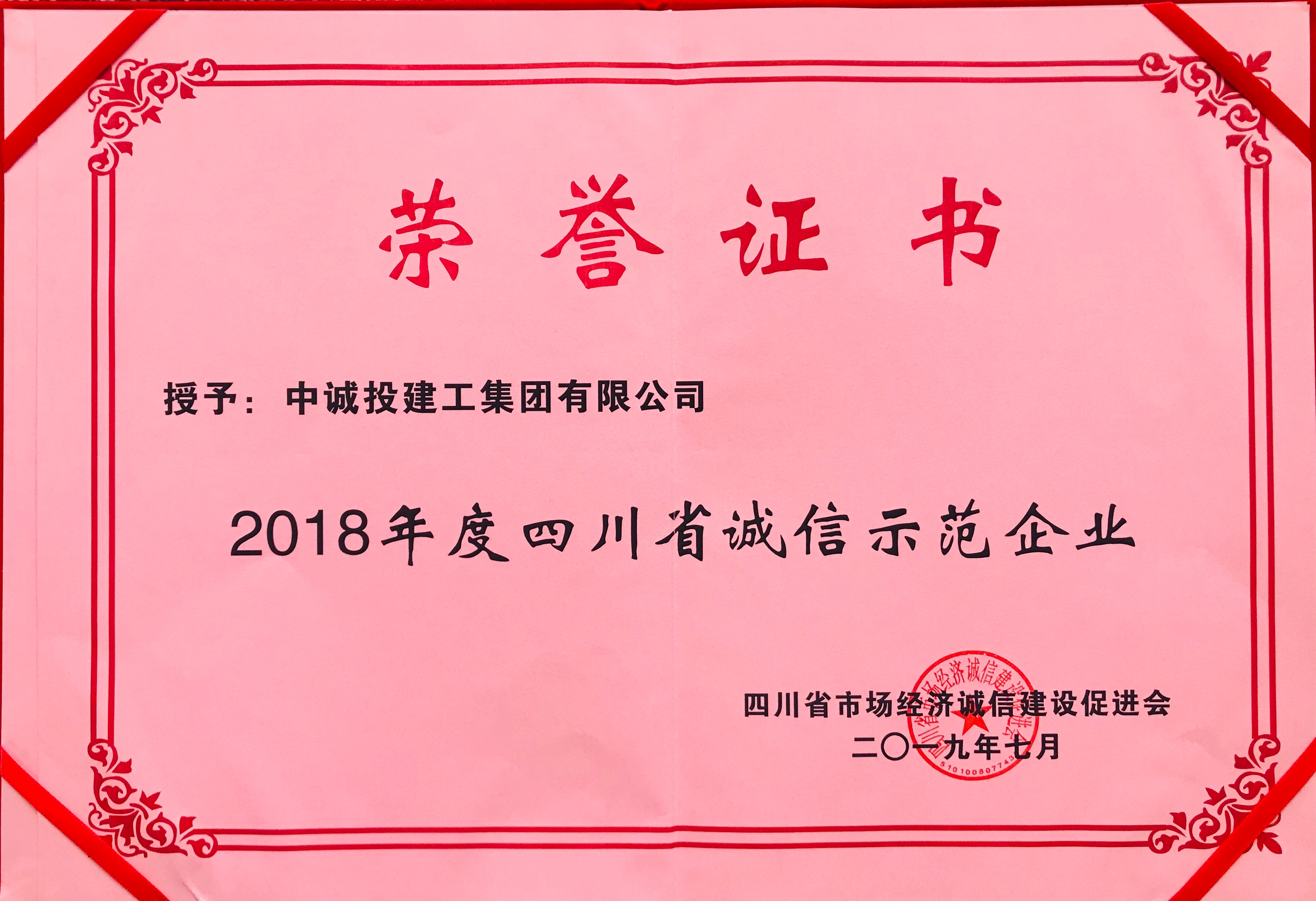 本次會議以“凝聚誠信力量,助力企業發展”為主題,共同探討企業的誠信建設和發展方向,并對四川省誠信示范企業進行了表彰授牌。中誠投建工集團憑借良好的企業信譽,榮獲“2018年度誠信示范企業”稱號。