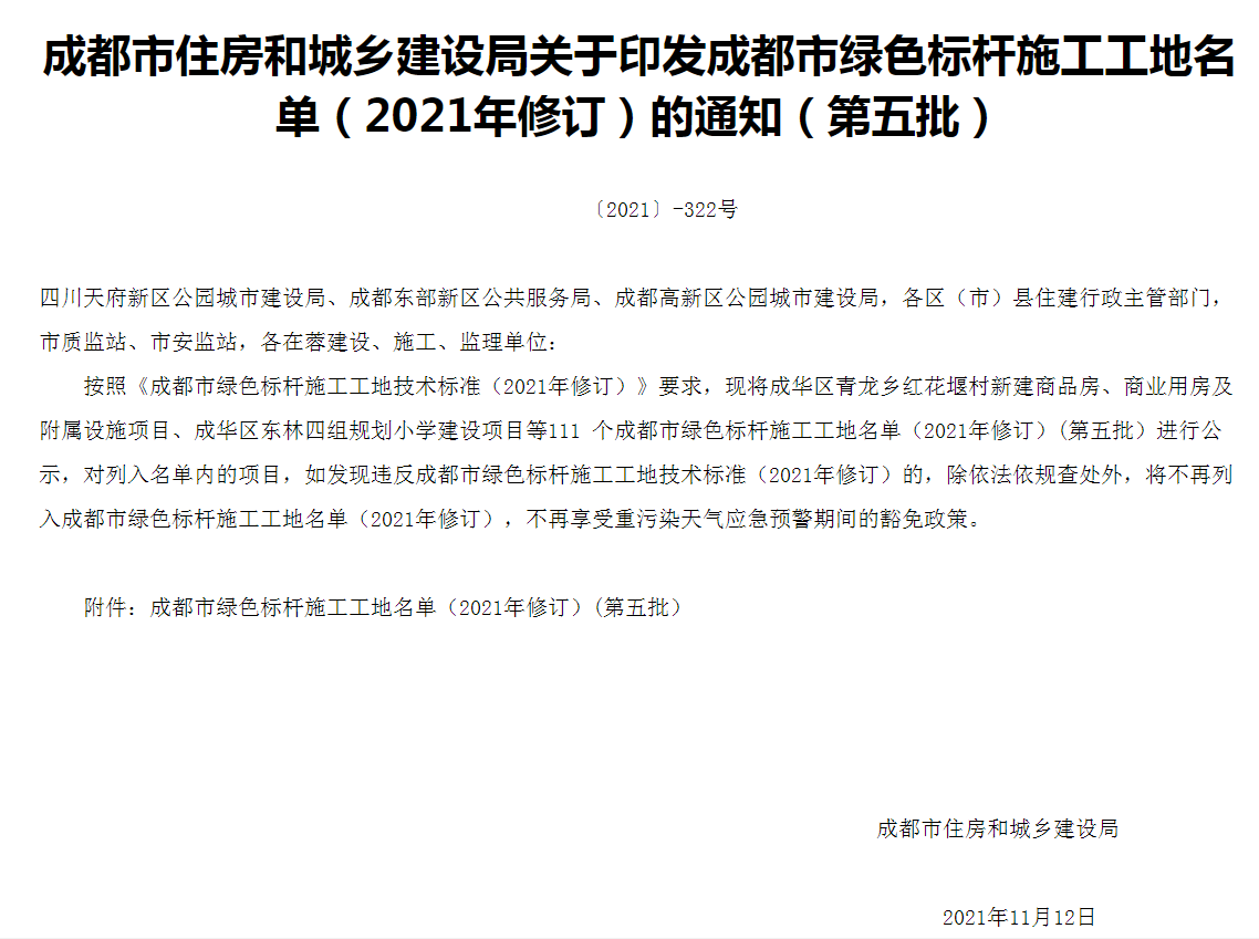 此次獲評是由成都市城鄉建設和住房建設局根據《成都市綠色標桿施工工地技術標準(2021年修訂)》組織實施評選的,中誠·鉑悅府項目經過嚴格考核,從參評的眾多單位中成功入圍,將在重污染天氣應急預警期間執行豁免政策。