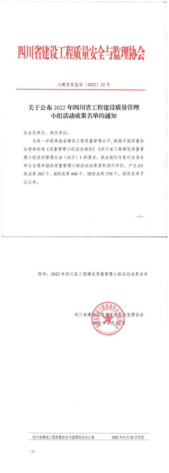 近日,四川省建設(shè)工程質(zhì)量安全與監(jiān)理協(xié)會公布了2022年四川省工程建設(shè)質(zhì)量管理小組活動成果名單,集團公司10項QC成果榮獲四川省工程建設(shè)質(zhì)量管理小組活動成果獎,其中I類成果獎1項,Ⅱ類成果獎6項,Ⅲ類成果獎3項。