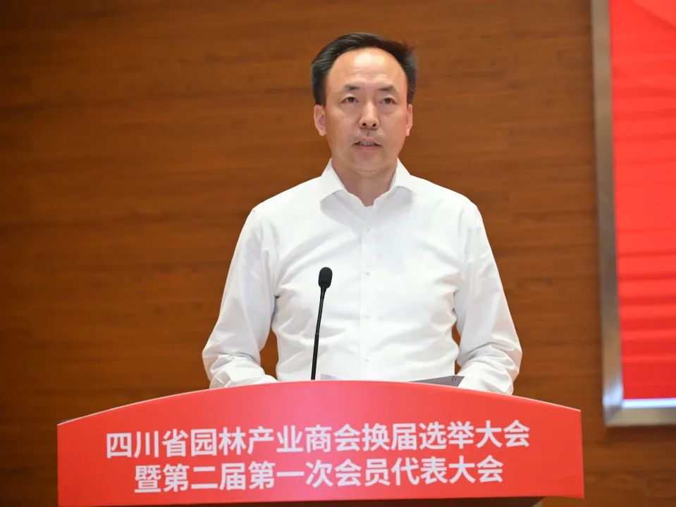 四川省工商聯黨組成員、副主席鄭宗強作指導講話。他代表四川省工商聯、四川省商會向園林產業商會離任的第一屆領導班子為商會建設和園林產業發展作出的卓越貢獻表示感謝,向新當選的理事會、監事會和領導班子成員表示熱烈的祝賀。