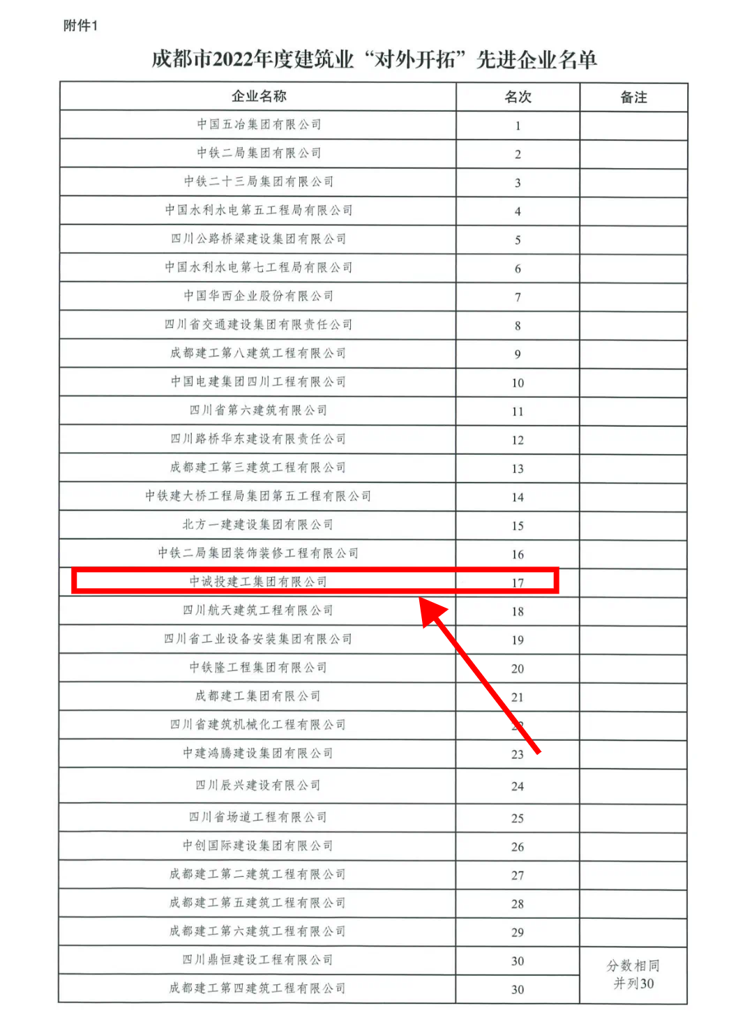 近日,成都市2022年度建筑業“對外開拓”先進企業榜單正式發布,中誠投建工集團以突出的對外開拓業績榮登榜單。
