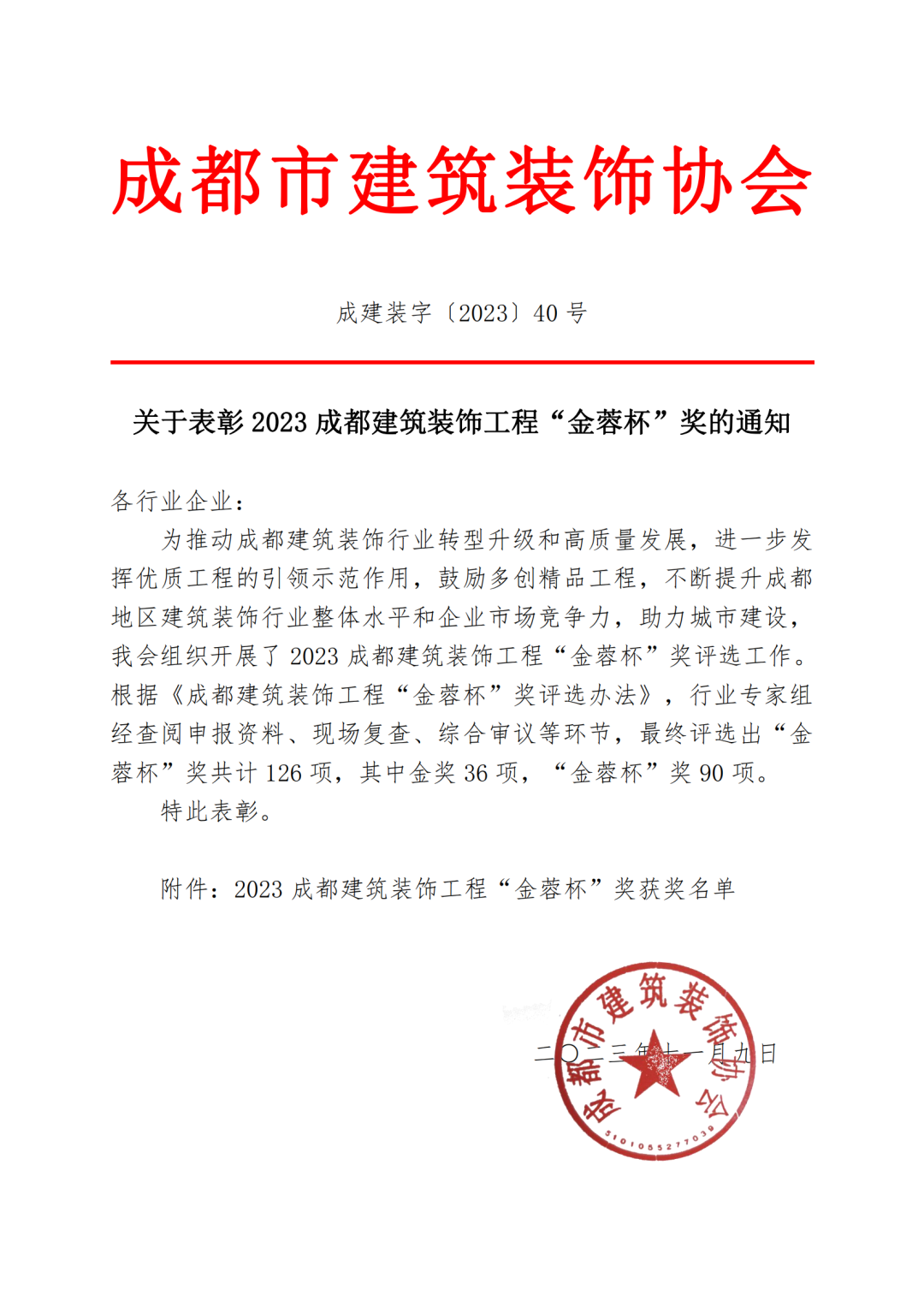 “金蓉杯”獎是成都市建筑裝飾工程最高榮譽(yù)獎項,由成都市建筑裝飾協(xié)會組織評選,旨在鼓勵建筑企業(yè)提高施工質(zhì)量及管理水平,增強(qiáng)低碳環(huán)保意識,多創(chuàng)精品工程,不斷提升成都地區(qū)建筑裝飾行業(yè)整體水平和企業(yè)市場競爭力,助力城市建設(shè)。
