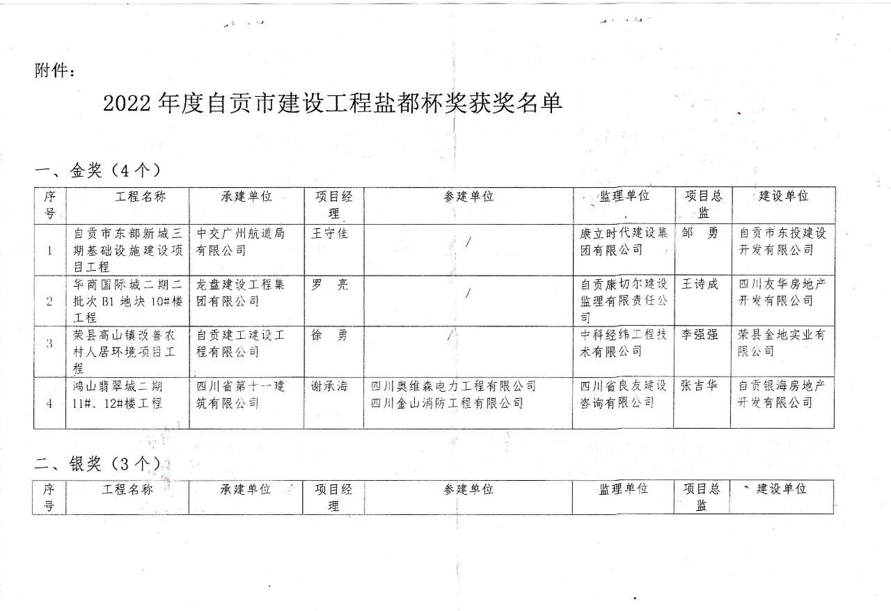 近日,自貢市建筑業協會、自貢市總商會建筑業商會組織召開2023年度總結表彰暨2024年工作大會。大會公布了2022年度自貢市建設工程“鹽都杯”獲獎名單,由中誠投建工集團承建的自貢職業技術學校實習基地大樓建設項目(2、3號樓)工程榮獲“鹽都杯”銀獎。