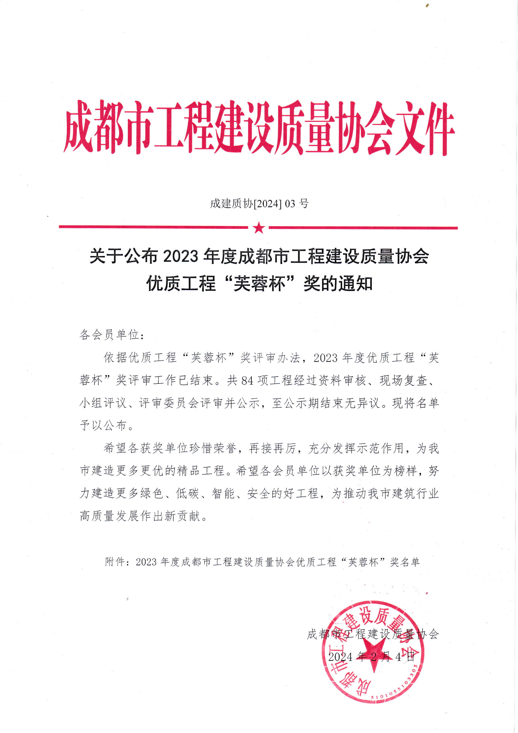 成都市優(yōu)質(zhì)工程“芙蓉杯”獎(jiǎng)由成都市工程建設(shè)質(zhì)量協(xié)會(huì)組織評選,旨在以更高的標(biāo)準(zhǔn)、更嚴(yán)的要求,推動(dòng)成都市打造更多技術(shù)先進(jìn)、品質(zhì)優(yōu)秀的精品工程,是成都市城鄉(xiāng)建設(shè)工程質(zhì)量的市級榮譽(yù)獎(jiǎng)。