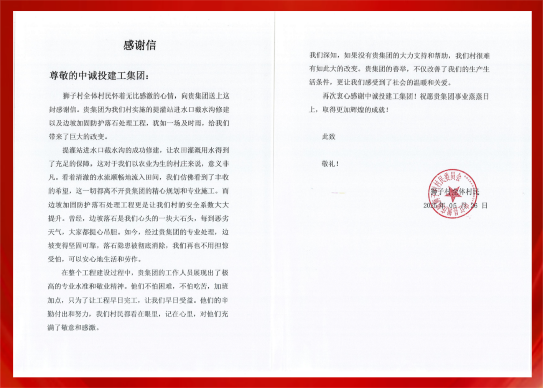 在感謝信中,獅子村全體村民對項目團隊展現出的專業水準和敬業精神給予高度贊譽,對他們在工程建設過程中不畏艱難、全力建設的奉獻精神表達了由衷的感激之情。這封感謝信不僅承載著村民們的深情厚誼,更是對中誠投服務民生、助力地方發展的高度認可。